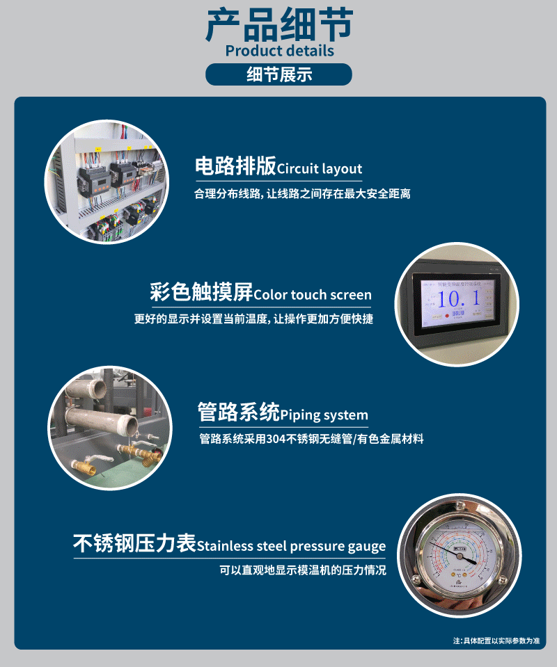 注塑模具模溫機(jī)配備高效的加熱元件,能夠快速達(dá)到所需的工作溫度,并具有快速的溫度響應(yīng)能力。設(shè)備采用智能溫度控制系統(tǒng),能夠**地控制模具的溫度,確保在整個(gè)注塑過(guò)程中保持穩(wěn)定的溫度。